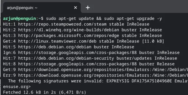 1. Antes de usar aplicativos Linux em um Chromebook, você deve primeiro atualizar a versão do Linux para a versão mais recente. Como uma boa prática do Linux, você deve executar o comando abaixo no Terminal, pois ele atualizará todos os pacotes e dependências. Basta copiar e colar o comando na janela do Terminal.