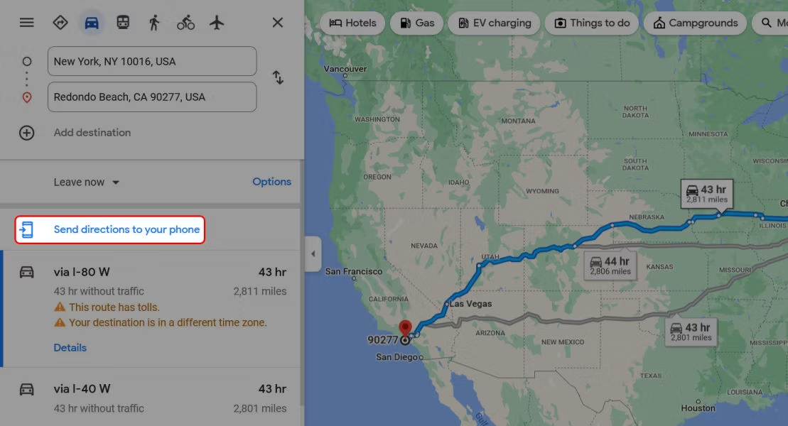 1. Depois de traçar sua rota, clique em Enviar direções para seu telefone no painel esquerdo.
