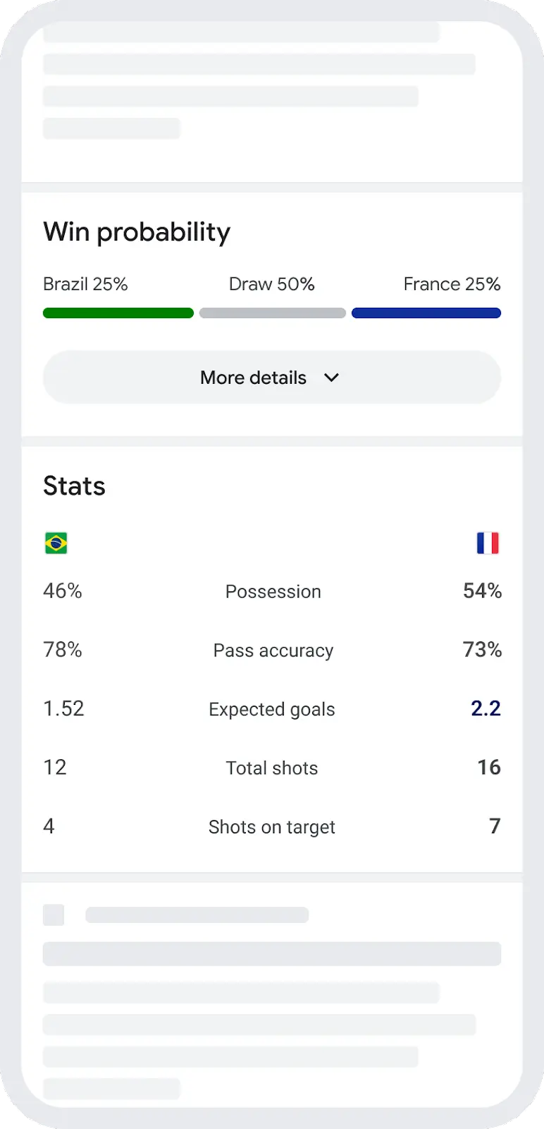 Ao pesquisar sobre os jogos, o Google traz estatísticas, gráficos e cronogramas detalhados. Com muitas partidas acontecendo ao mesmo tempo, especialmente durante a primeira fase do torneio, os resultados das partidas agora será possível fixar o resultado da partida ao vivo em dois telefones Android para poder vê-lo facilmente e acompanhá-lo em todos os momentos.