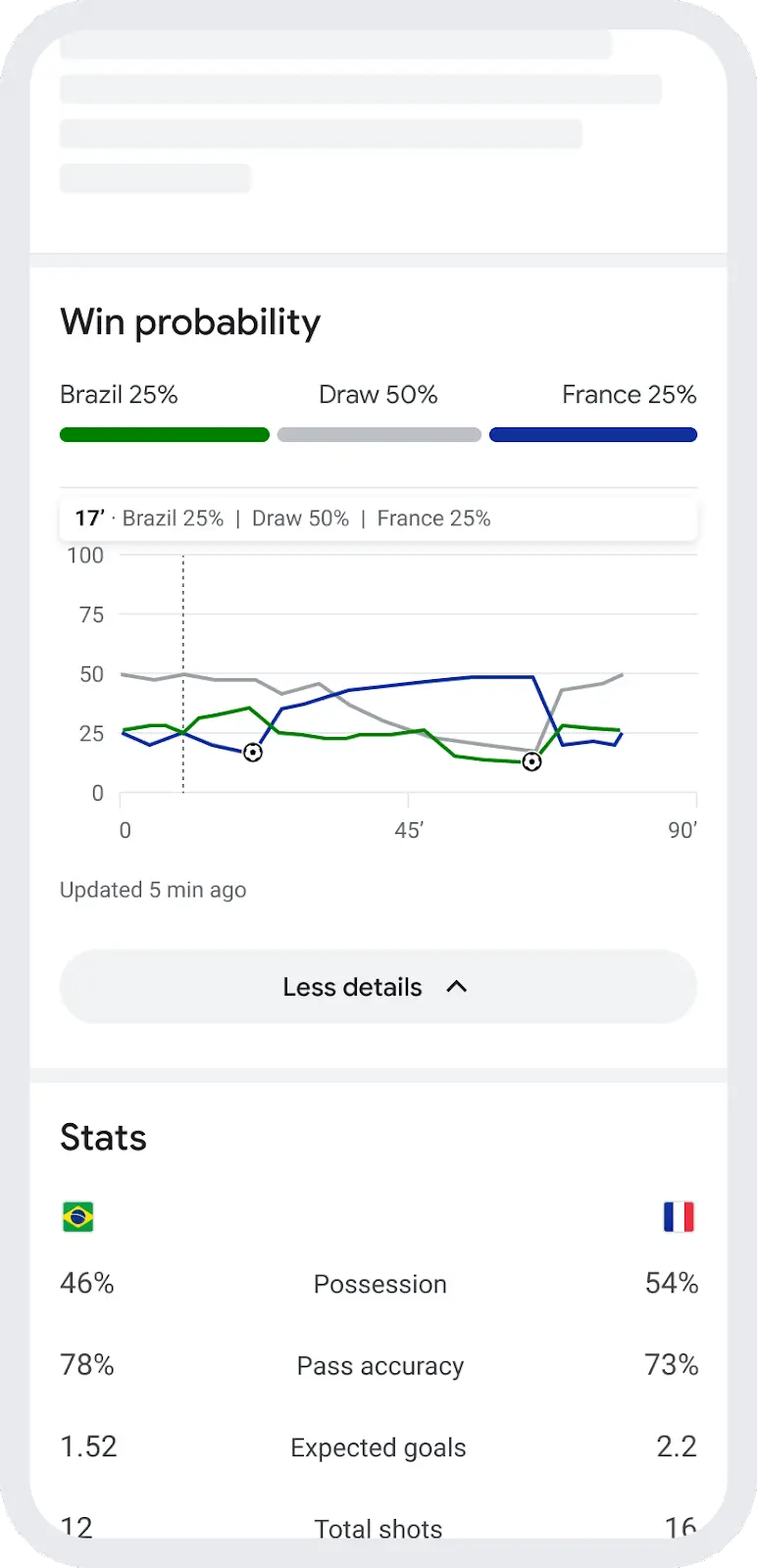 Outra novidade são as estatísticas antes e durante a partida. Assim, os torcedores poderão ver como a partida está progredindo entre as duas equipes com base em eventos importantes, como gols, posse e passes de bola ou cartões, e a partir desses dados, mostrar a probabilidade de vitória de cada seleção.