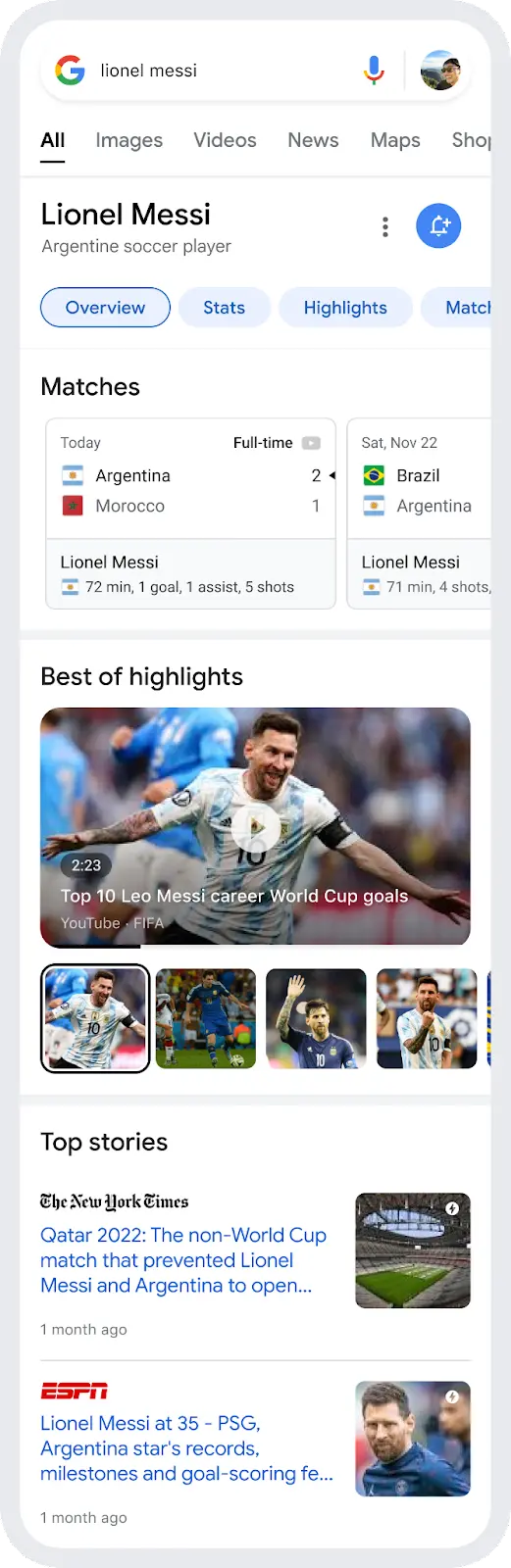 Além disso, o Google fornecerá dados de desempenho durante o jogo e mostrará os melhores vídeos do jogador em campo. Ao habilitar a campainha no perfil de um atleta, os fãs receberão notificações e ficarão por dentro do que acontece com ele durante o torneio.