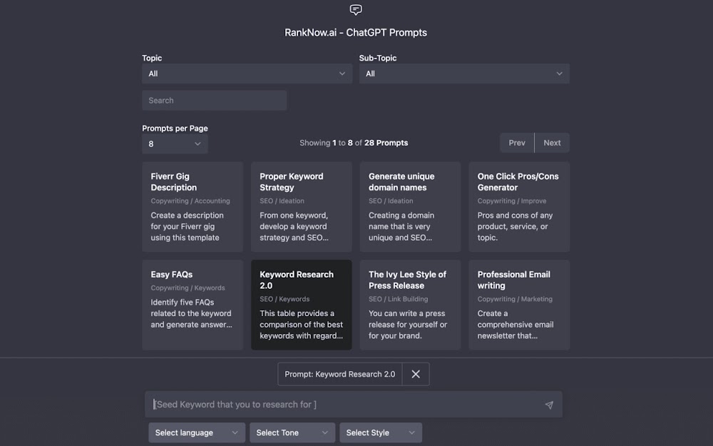 Com 60 prompts disponíveis, RankNow.ai oferece desde sentimentos, estratégia de palavras-chave, geração rápida de prós e contras sobre qualquer assunto, e muito mais.