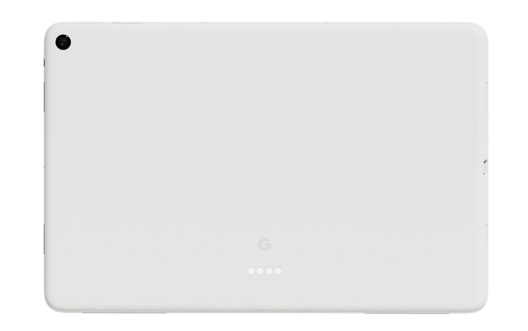 Na borda inferior, há duas protuberâncias que podem ser pontos de conexão para um possível acessório de teclado ou capa. A Pixel Tablet é de cor branca ou bege claro, com um acabamento em nanocerâmica que dá uma sensação cerâmica.