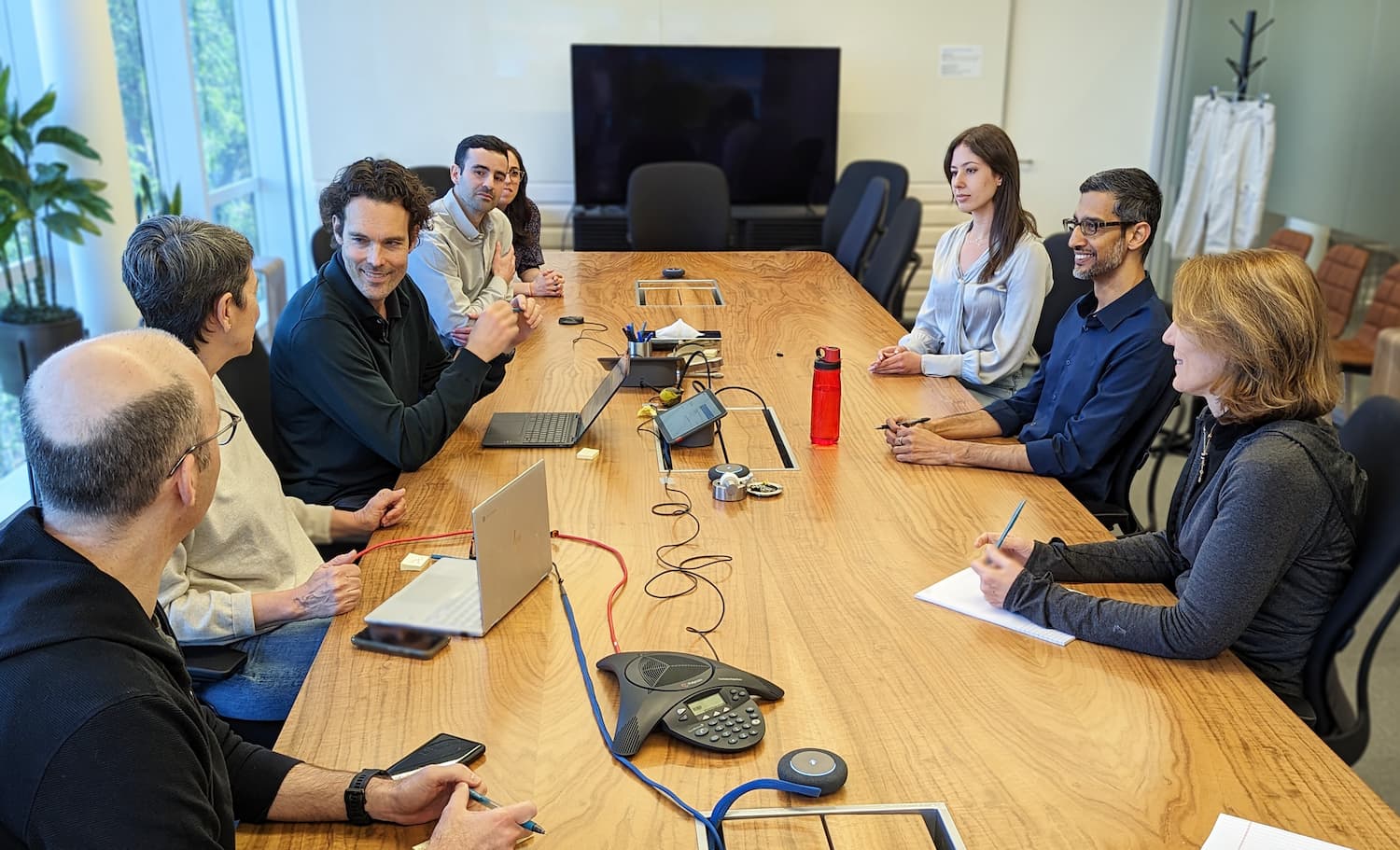 Na imagem, Pichai aparece ao lado de outros executivos da empresa, em uma sala de reunião, com um tablet e um dispositivo não identificado na mesa.
