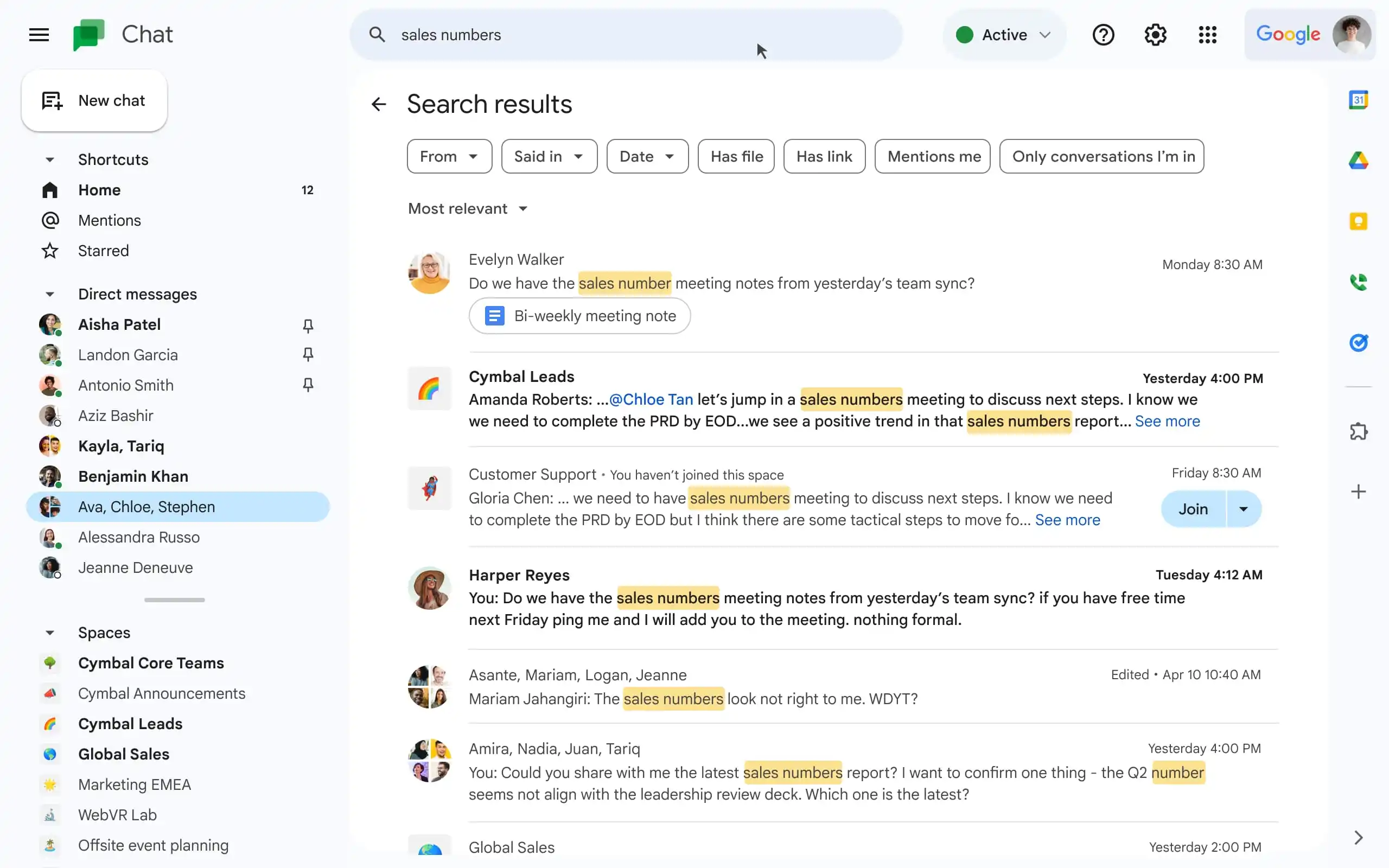 Outra adição interessante é o recurso “huddle”, localizado no canto superior direito das conversas, que permite iniciar rapidamente uma chamada no Google Meet com todos os participantes do chat atual.