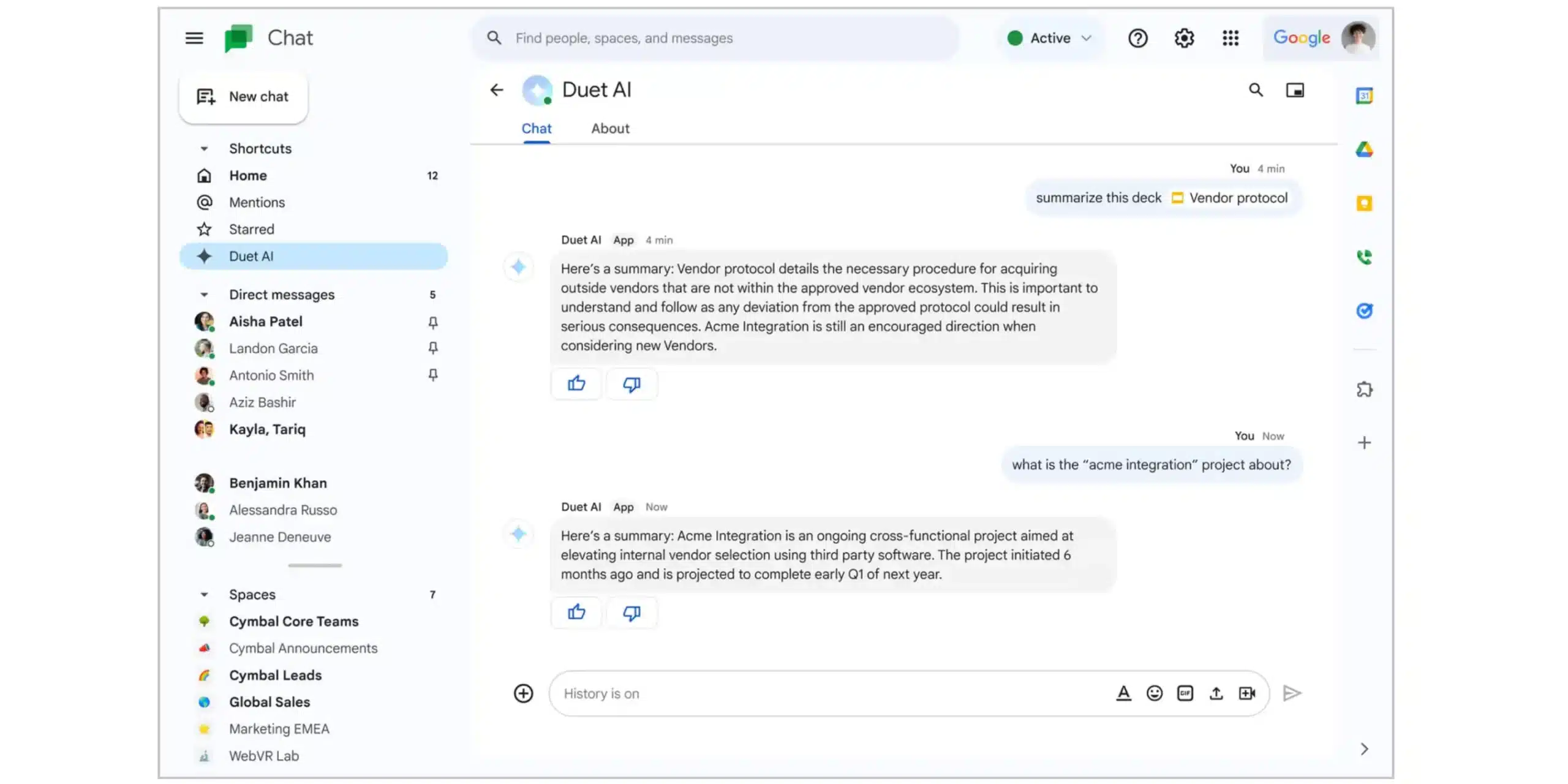 Uma das novidades mais empolgantes é a introdução do Google Chat Duet AI. Agora será possível conversar com o Duet AI, que se propõe a responder a “consultas complexas” pesquisando mensagens e arquivos no Gmail e Drive.