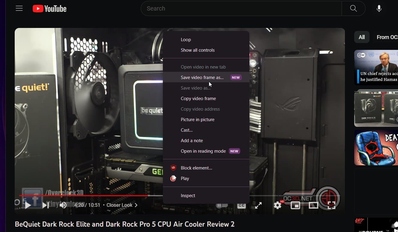 Ao clicar duas vezes com o botão direito do mouse no player de um vídeo do YouTube, os usuários verão uma nova opção chamada “Salvar frame de vídeo como…”, ao lado da opção já existente de “Copiar frame de vídeo”.