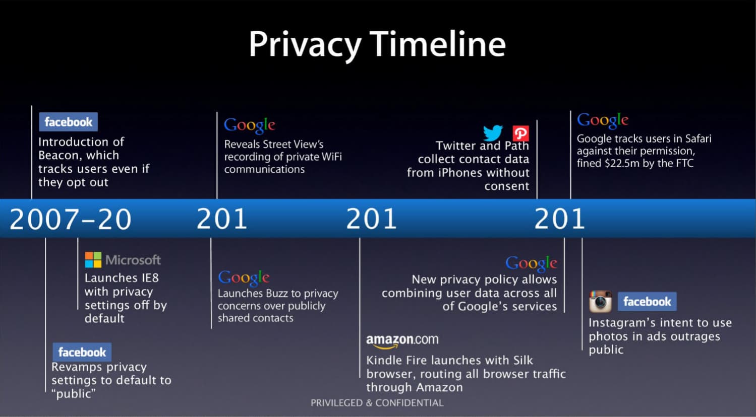 A “linha do tempo de privacidade” apresentava eventos dos anos 2000 e 2010 que tiveram repercussão na privacidade, como o registro de redes Wi-Fi privadas pelos carros do Google Street View, a tentativa do Instagram de utilizar fotos de usuários em seus anúncios e a política de privacidade do Google que combinava dados do usuário em diferentes serviços.