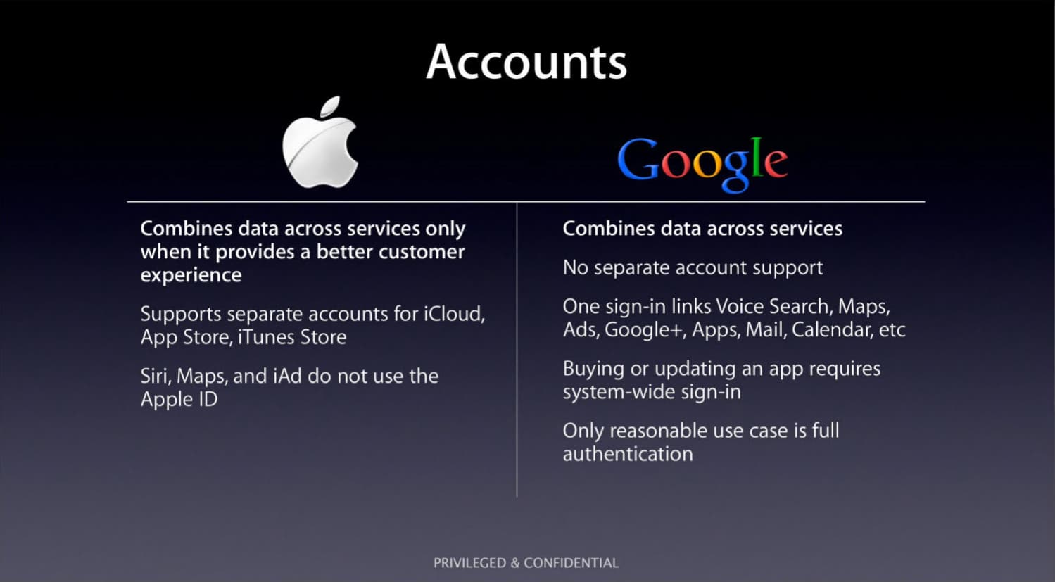 A apresentação em questão discutia a estratégia da Apple para competir com base na privacidade. Os slides analisavam como os competidores da Apple, em particular o Google, o Facebook, a Amazon e a Microsoft, lidavam com questões de privacidade e dados do usuário.