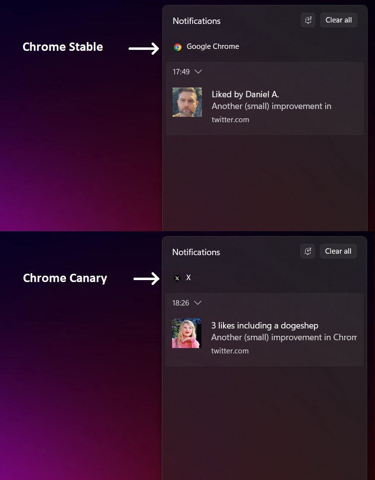 Essa melhoria visa proporcionar uma experiência mais personalizada aos usuários ao substituir o nome e o logotipo do Chrome nas notificações pelo nome e ícone do web app em questão.