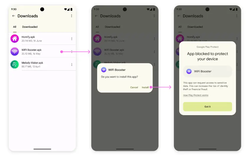Essa nova versão do Google Play Protect bloqueia automaticamente a instalação de aplicativos com permissões sensíveis, uma prática frequentemente usada por fraudadores para interceptar senhas ou espionar dados do dispositivo.