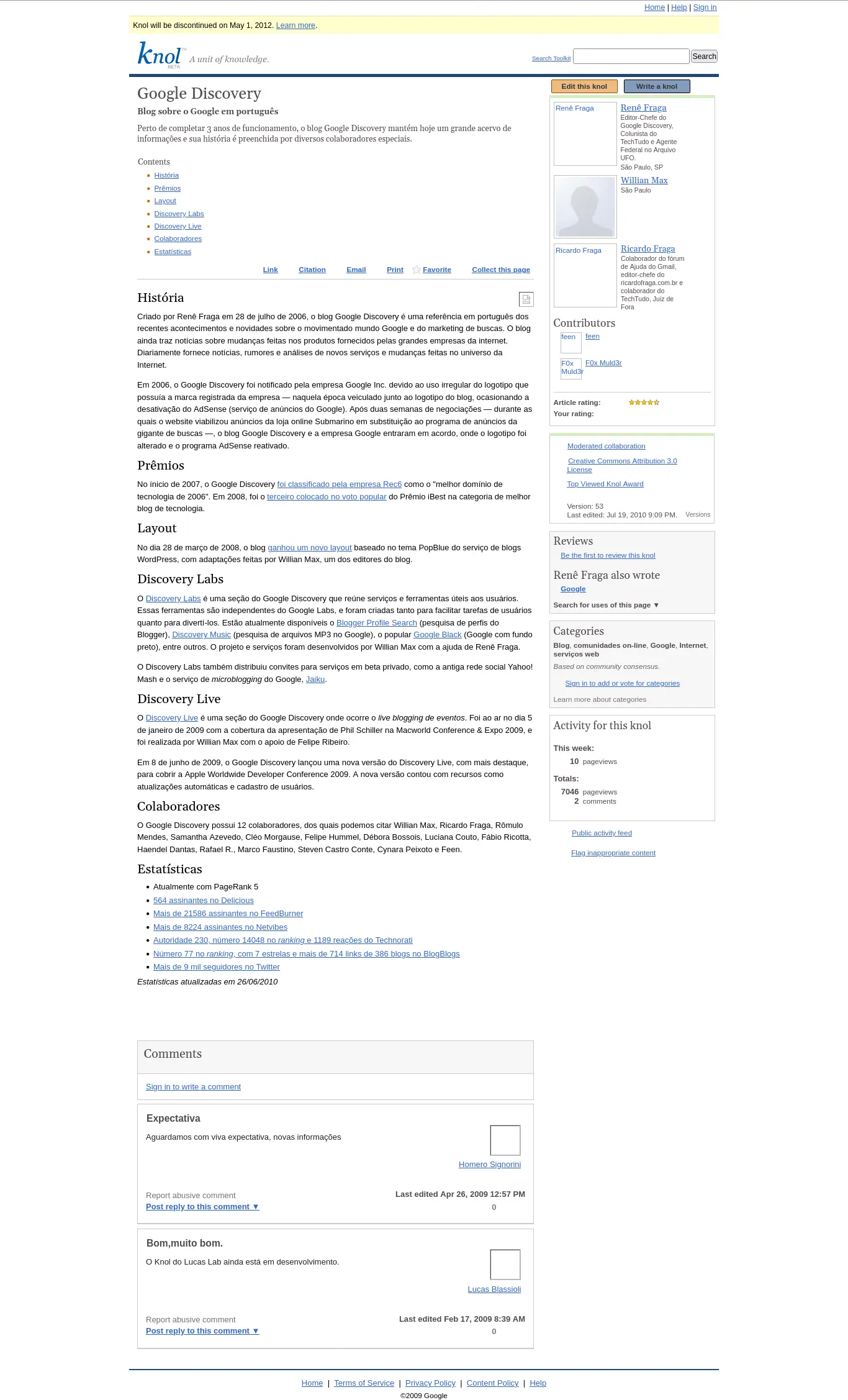 Abaixo, você pode relembrar o Knol do Google Discovery, escrito pelos ex-editores do blog, Willian Max e Ricardo Fraga. Ou visualizar a versão guardada no Archive.org.