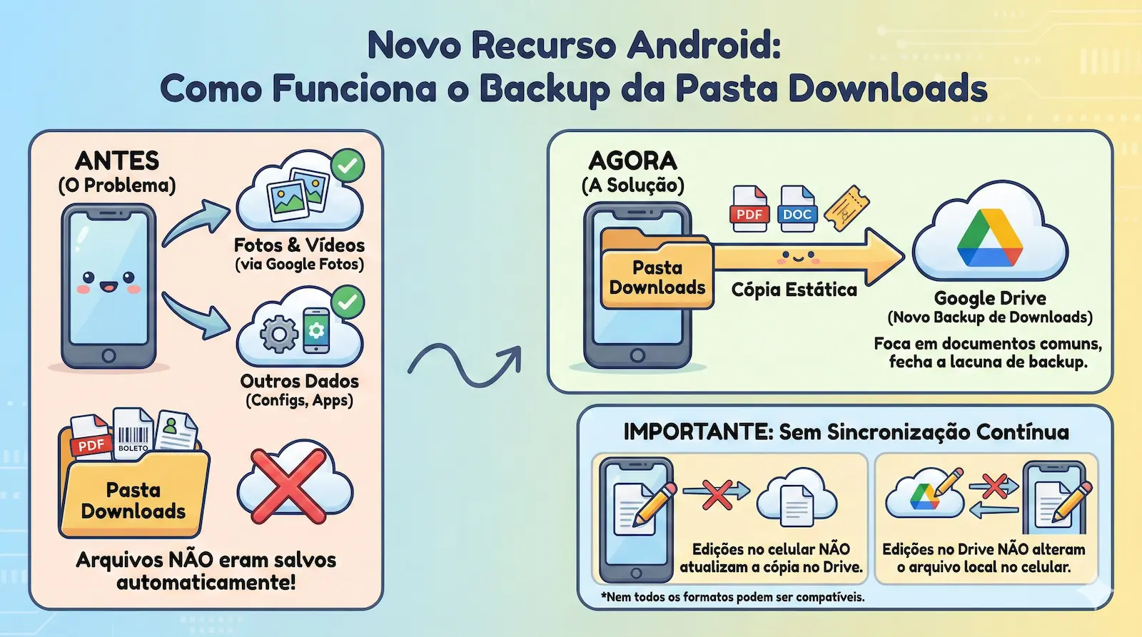 Até então, fotos, vídeos, contatos e histórico de chamadas já contavam com backup automático. Porém, documentos armazenados na pasta Downloads ficavam desprotegidos.